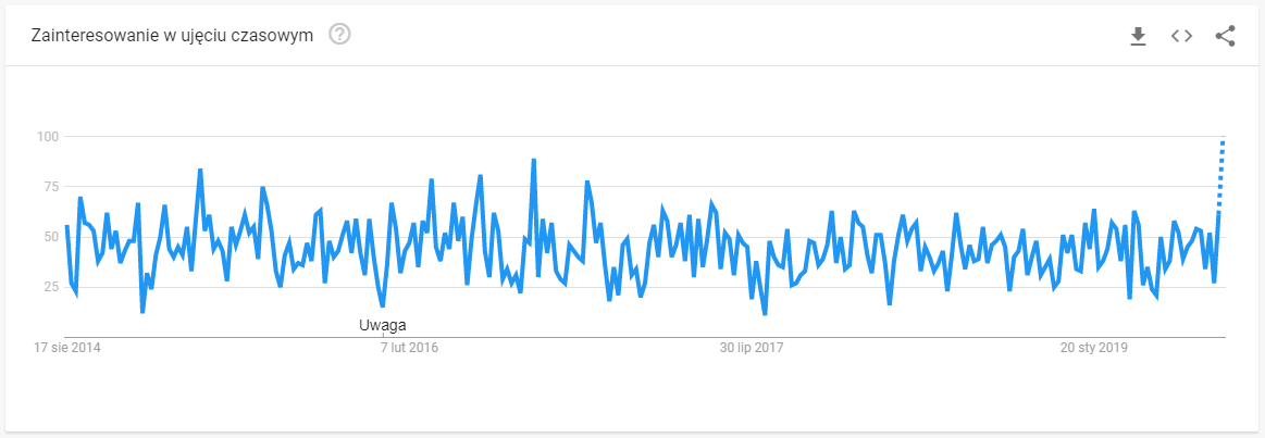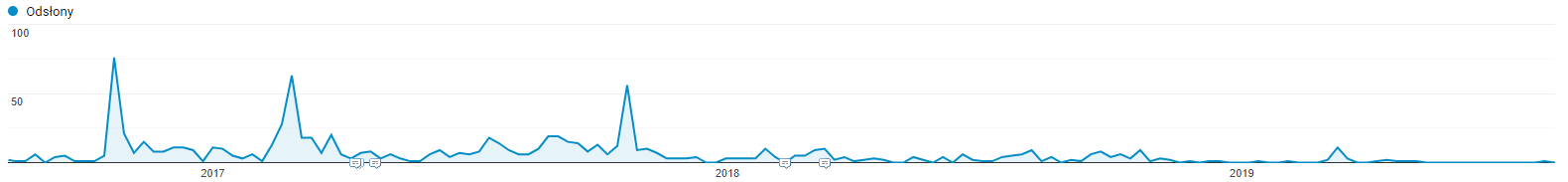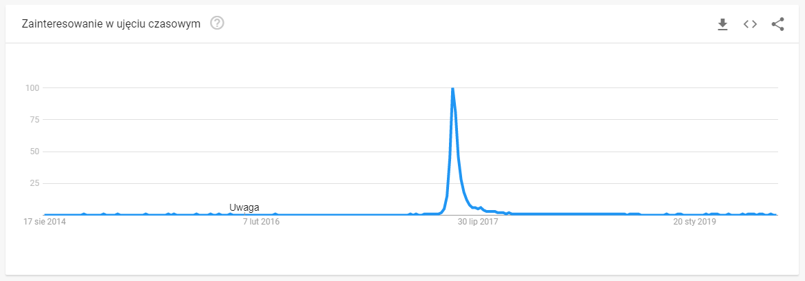 Z drugiej strony mamy przykład tekstu, który rzadko przyciąga ruch. Zainteresowanie rosło wyłącznie w okresie eventu. W pozostałych tygodniach było dość marginalne.