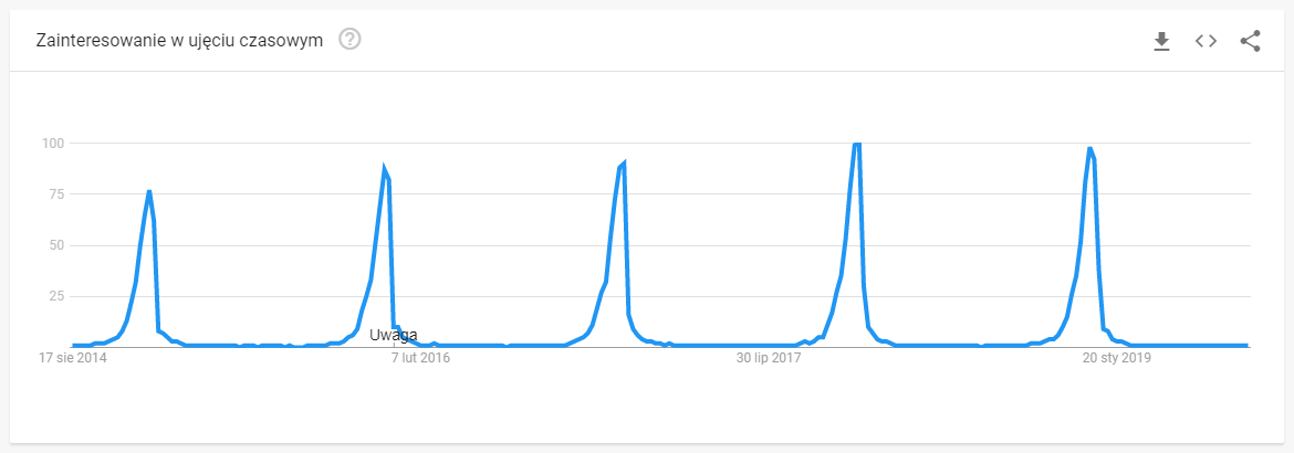 Typowy trend powracający. Widać, że zainteresowanie tematem jest duże dokładnie raz w roku. Nie jest to treść wiecznie żywa. Nadal jednak opłaca się tworzyć o niej artykuły. Zacznij je promować odpowiednio wcześnie, aby trafić do konsumenta w najlepszym momencie.