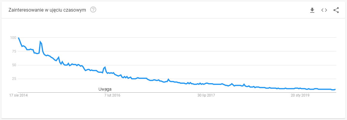 Trend spadkowy powinien Cię zawsze zaniepokoić. Zazwyczaj mija kilka miesięcy, zanim nowy artykuł pojawi się na wysokich pozycjach Google. Może się okazać, że wtedy już nikt nie będzie zainteresowany takim tematem.