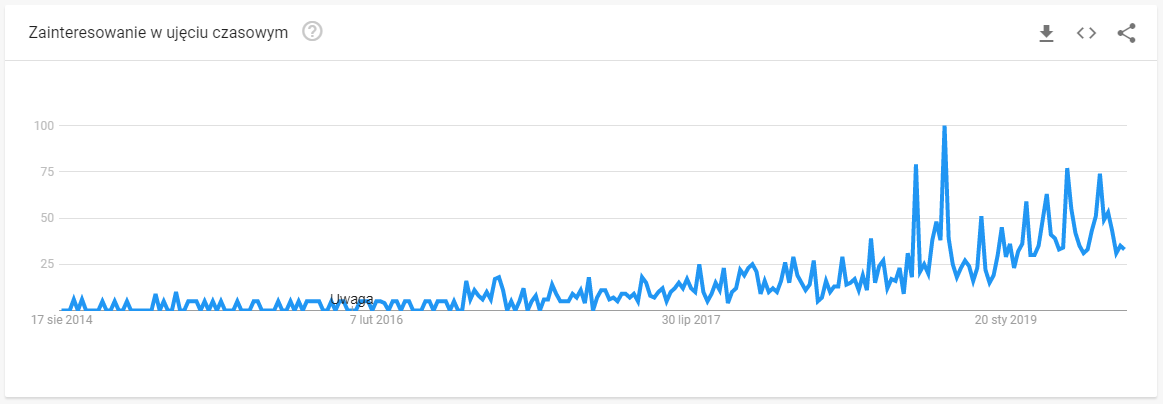 Widać duży wzrost, a potem szczątkowe zainteresowanie zabawką. Artykuły bardzo opłacało się tworzyć przed i na początku wzrostu zainteresowania. Dzisiaj zainteresowanie jest znacznie niższe. Przyjrzyj się, czy nadal jest sens tworzenia treści na takie hasło.