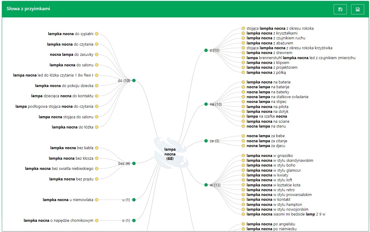 Gdy stwierdzisz, że ze strukturą kategorii na Twojej stronie jest coś nie tak, lub po prostu chcesz się jej bliżej przyjrzeć i sprawdzić, czy można coś w niej poprawić, przydatna okaże się baza słów kluczowych — dostępna m.in. w narzędziu SEMSTORM. Znajdziesz w niej podpowiedzi, jakich fraz powiązanych z głównym zapytaniem poszukują użytkownicy. Poniżej przykład dla: „lampa nocna”.