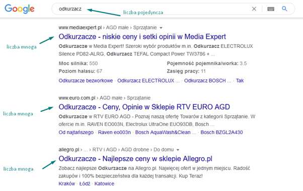 - Stosując na stronie nazwy kategorii w liczbie mnogiej łatwiej wyrankować stronę na frazy w takich odmianach. Mamy też pewnego rodzaju umowne rozdzielenie mówiące, że frazy w liczbie mnogiej powinny być dopasowane do kategorii, a w liczbie pojedynczej do produktów. Nie będzie tak jednak zawsze, co widać na poniższym przykładzie.