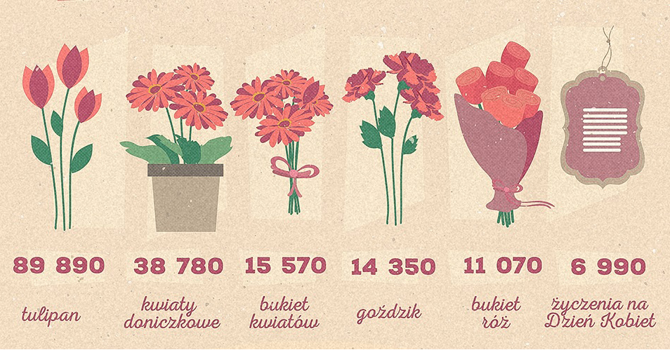 Tradycyjnie, 8 marca, wręcza się kobietom kwiaty. Również informacje zebrane przez SEMSTORM potwierdzają, iż to właśnie one w okresie poprzedzającym Dzień Kobiet cieszą się w Google największą popularnością. Najczęściej wyszukiwanymi frazami są wtedy „tulipany” (89 890 wyszukiwań), „kwiaty doniczkowe” (38 780) oraz „bukiet kwiatów” (15 570). Dostępne w PRL’u goździki także mają swoich fanów – fraza „goździk” w marcu wyszukiwana jest aż 14 350 razy.