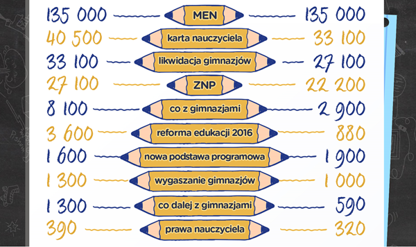 W czerwcu najczęściej wpisywanymi w pole wyszukiwarki frazami były Ministerstwo Edukacji Narodowej (z liczbą wyszukiwań 135 000), Karta Nauczyciela (40 500), Związek Nauczycielstwa Polskiego (znp: 27 100 zapytań),likwidacja gimnazjów (33 100) oraz co z gimnazjami (8 100), będące wynikiem obaw pedagogów. Czy zainteresowanie internautów zmalało? Zapraszamy do zapoznania się z infografiką.