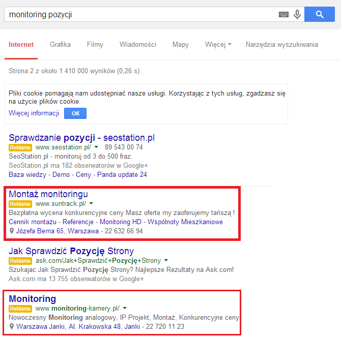 Bardzo dobry przykład. Na zapytanie o wynajem biura w Olsztynie wyświetliły się 4 reklamy oferujące biuro w Warszawie i… jedna w Gliwicach. O ile zapytanie zostało faktycznie wysłane z biura SEMSTORM w Warszawie, o tyle Gliwice są bardzo ciekawą niespodzianką.