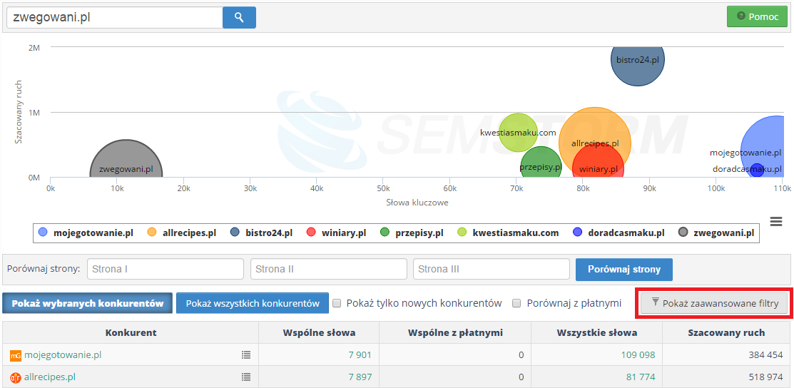 Analiza konkurencji to jedno z podstawowych działań przy planowaniu nowej kampanii jak i weryfikacji tego, czego już dokonałeś. Przedstawiamy parę podstawowych sposobów jak dokonać takiego porównania w SEMSTORM. W SEMSTORM możesz nie tylko sprawdzić, z którą stroną rywalizujesz w naturalnych wynikach wyszukiwania. Niezwykle istotne jest, aby zobaczyć, dzięki którym słowom Twój konkurent jest wyżej i przyciąga do siebie większą liczbę użytkowników.