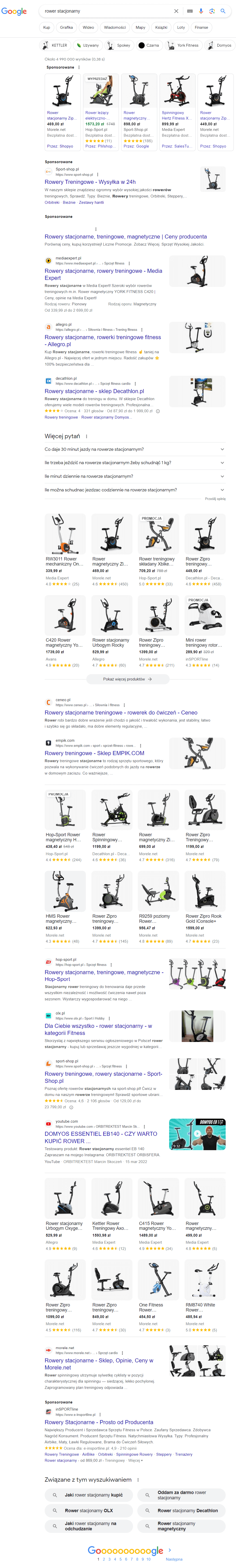 To jednak nie zmienia faktu, że ogólne zapytanie „rower stacjonarny” ma intencję transakcyjną i można je zaliczyć do wspomnianych wcześniej money keywords (bo ma potencjał, by wygenerować zysk). Jeśli wpiszesz hasło do Google, zobaczysz Product Listing Ads, reklamy tekstowe, a w wynikach organicznych głównie strony kategorii w sklepach.