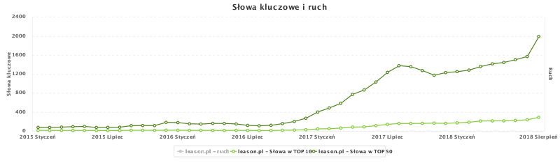 Leason jest firmą z Krakowa, która pomaga uzyskać finansowanie na leasing dla przedsiębiorstw oraz organizuje leasing samochodów i maszyn. Zaraz przed rozpoczęciem naszej współpracy zmienili stronę, pomagaliśmy więc optymalizować ją od zera i wspieraliśmy przy tworzeniu nowych treści. Zaczęliśmy współpracę w październiku 2016 roku. Początkowy ruch organiczny na stronie: 408 użytkowników.