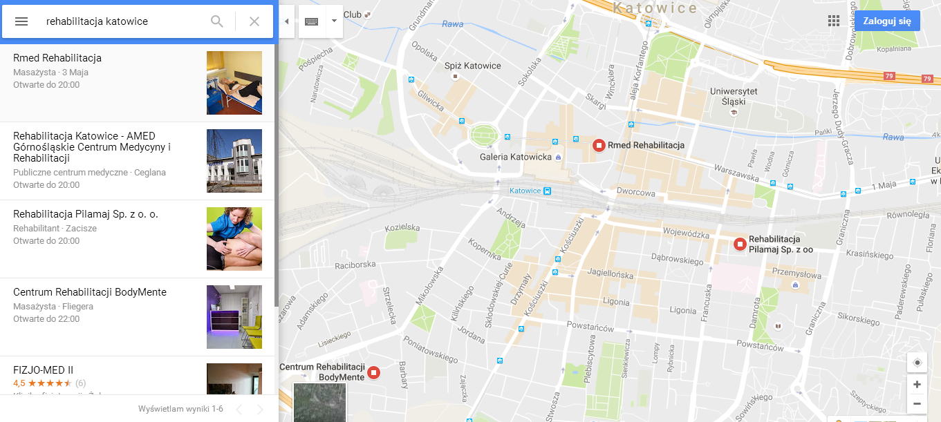 Co istotne w przypadku fraz regionalnych, często na pierwszej podstronie „ogólnych” wyników Google (czyli w domyślnej zakładce „Wszystko”) pojawia się kilka wizytówek pochodzących z rankingu Google Maps. Kiedyś wyświetlały się one pomiędzy pozycjami wyników naturalnych, obecnie jednak wyprzedzają je, niejako spychając w dół. Bywa, że poniżej linii przewijania ekranu, zwłaszcza jeśli pod danym hasłem występują także reklamy Google AdWords.