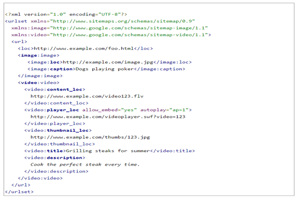 Przykładowa mapa witryny w formacie XML, w której zawarte są: jeden adres URL oraz informacje na temat plików obrazów i wideo. Źródło: suport.google.com