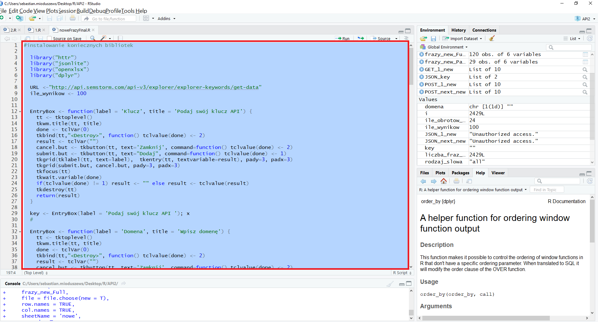 - Jsonlite (do przetwarzania plików typu JSON. API SEMSTORM zwraca odpowiedzi w tym formacie, więc dzięki tej bibliotece możemy przetworzyć odpowiedź serwera SEMSTORM).