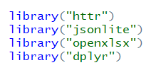 - Dplyr (do przetworzenia danych zwróconych przez API – jest to jedna z najpopularniejszych na świecie bibliotek języka R. W sieci dostępnych jest wiele materiałów ułatwiających pracę z nią).
