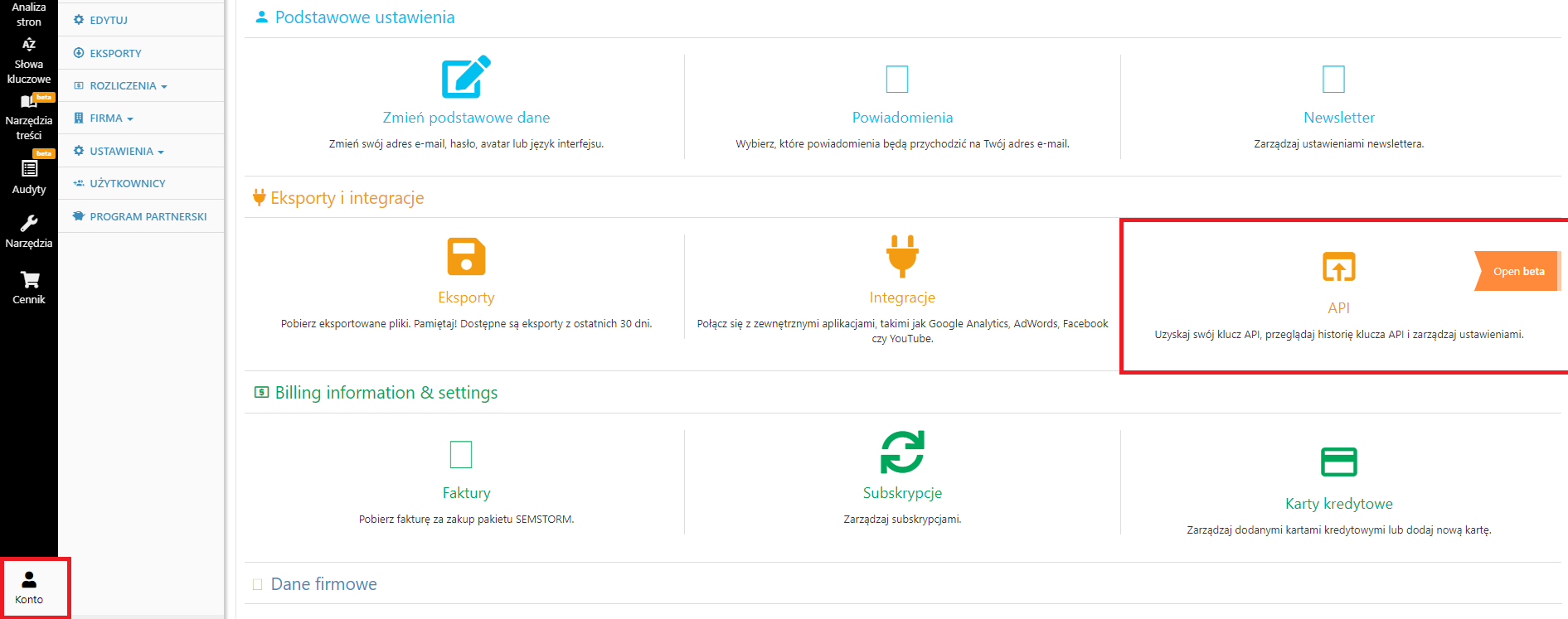 - Pobierz klucz API w panelu SEMSTORM. Jest on dostępny w menu Konto (z menu głównego) -> API. Klucz należy skopiować i w krokach, opisanych poniżej, wstawić do skryptu.