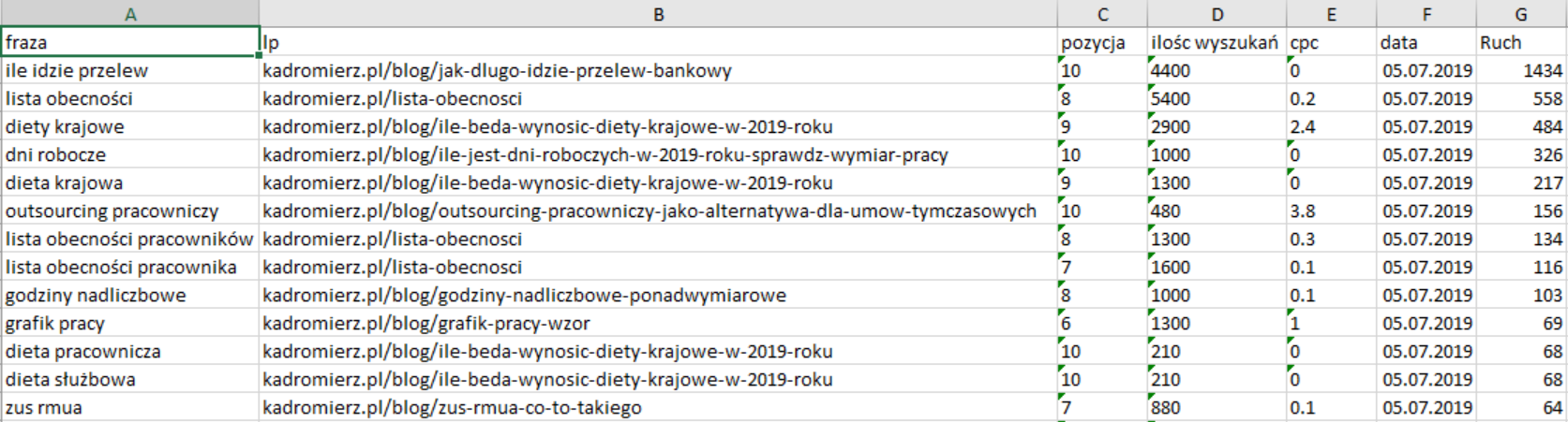 Ruch – wyliczona ilość sesji, którą uzyskała dana strona dzięki wyświetleniom na dane słowo kluczowe (na podstawie CTR dla danej pozycji wg. danych https://www.advancedwebranking.com/ctrstudy/).