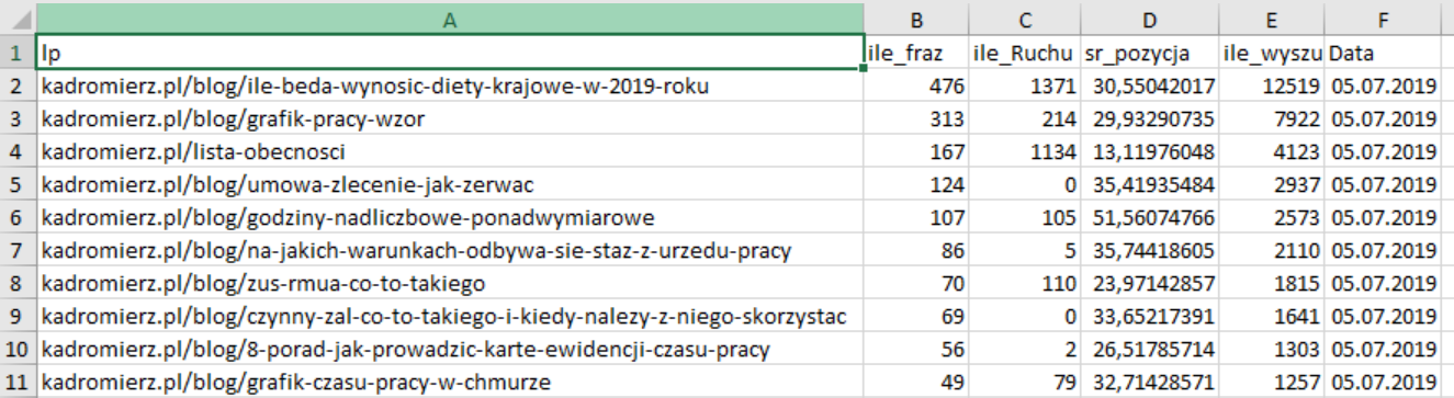 sr_pozycja — średnia pozycja dla wszystkich fraz, na które widoczna w Google jest dana podstrona.