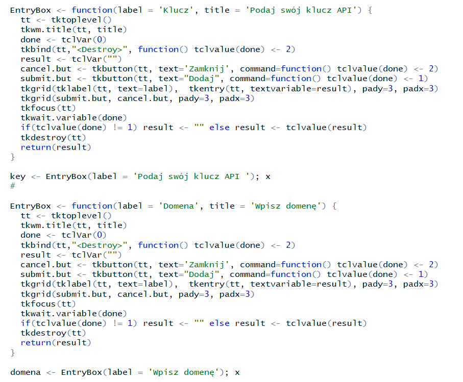 W tej części skryptu tworzymy dwa okna dialogowe. Do tych okien wpisujemy klucz API oraz nazwę domeny, dla której chcemy wygenerować raport. Wartości podane w tych oknach są przekazywane jako zmienne do skryptu.