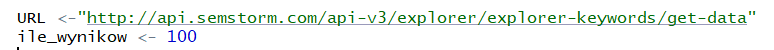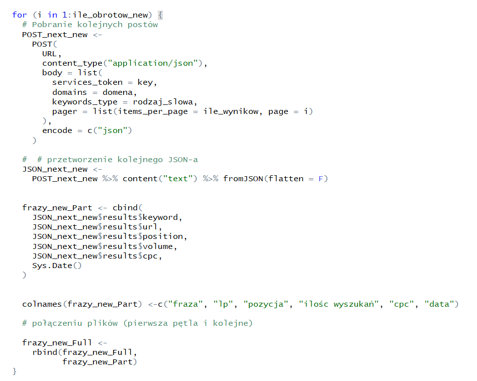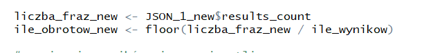 Chcąc pobrać wszystkie dane, musimy zrobić to w pętli z powodu ograniczenia API, które może jednorazowo zwrócić maksymalnie 100 fraz. W celu uruchomienia potrzebujemy poznać liczbę wyników (zmiennna liczba_fraz_new) oraz ilość obrotów pętli odpytującej API (zmienna ile_obotow_new).