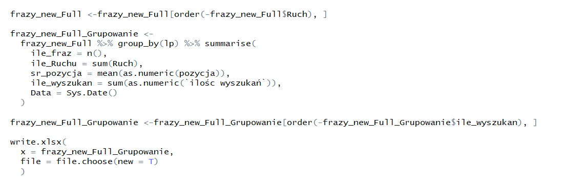 - Pobierz kompletny skrypt z lokalizacji: https://github.com/sebaSEO/Semstorm/blob/master/NoweFrazy.r