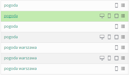 Monitorując urządzenia mobilne, w raporcie wyników naturalnych, w tabeli obok fraz pojawią się ikony określające, w jakich urządzeniach wyświetlone jest analizowane przez Ciebie słowo.