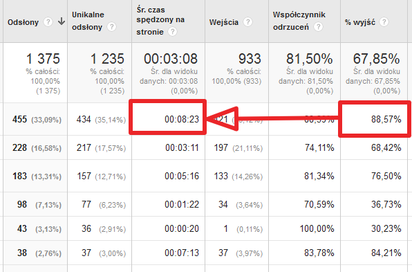 - słaba treść - słabej jakości content nie zatrzymuje czytelników, a więc może być przyczyną wysokiej wartości współczynnika wyjść; jednakże w tym przypadku wartość współczynnika wyjść należałoby analizować w powiązaniu z czasem spędzonym na stronie; jeśli współczynnik wyjść ma wysoką wartość, ale jednocześnie czas spędzony na stronie jest wysoki, to można przypuszczać, że przyczyną opuszczenia nie jest słaby content - czytelnikowi udało się znaleźć zawartość, dzięki której znalazł rozwiązanie swojego problemu, więc nie musiał szukać dalej.